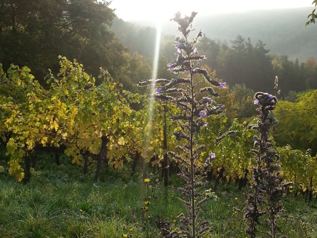 Die letzten Herbsttage tauchen die Weinberge noch einmal in ein weiches Licht. Nebel und Sonne kämpfen um die Vorherrschaft und lassen so zauberhafte Momente entstehen. Ist der Morgennebel verschwunden, bringt die Sonne die Herbstfärbung der Reben zum Strahlen. Besonders schön sieht man die unterschiedlichen Ausfärbungen am Günterslebener Sommerstuhl mit seinen schmalen Parzellen.