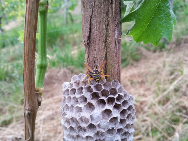 Sie ist überhaupt nicht agressiv – um das Bild zu machen musste ich eine ganze Weile vor der Wabe ausharren. Am Anfang hat sie sich immer vor mir versteckt. Im Weinberg hilft sie sogar die Schädlinge in Schach zu halten. Durch das Vertilgen von z.B. Zikaden, Traubenwicklerarten gehört sie zu den Nützlingen und darf natürlich bleiben!